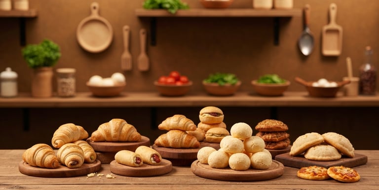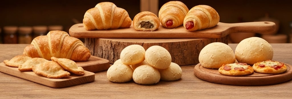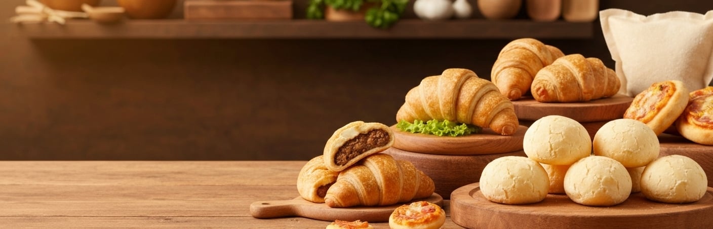 Massa fininha e crocante por fora, com recheios que derretem na boca nos sabores queijo ou presunto e queijo.